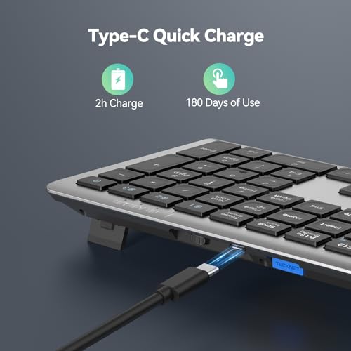 【500mAh Rechargeable Battery】This ultra-slim wireless keyboard is built with a 500mAh high-capacity rechargeable battery, eliminating the hassle of battery replacement for energy saving. The auto-sleep mode wakes up instantly with any key press, without delay. 2-hour charge can last up to 180 days (estimated based on 2 hours of daily use)