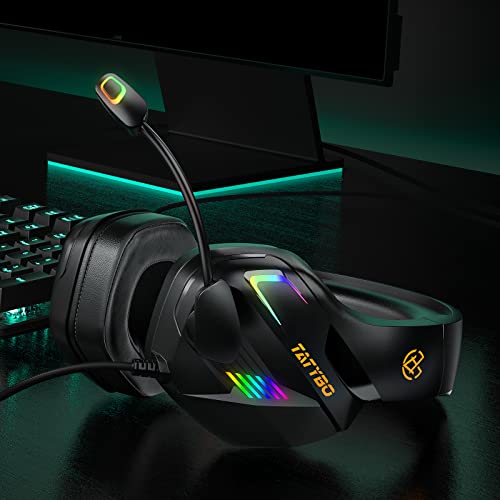 Tatybo Gaming Headset for PC PS5 PS4 XboxOne, Gaming Headphone with 50mm Drivers 3D Surround Sound, Noise-Cancelling Mic, Soft Memory Earmuffs & 4 Modes RGB Light