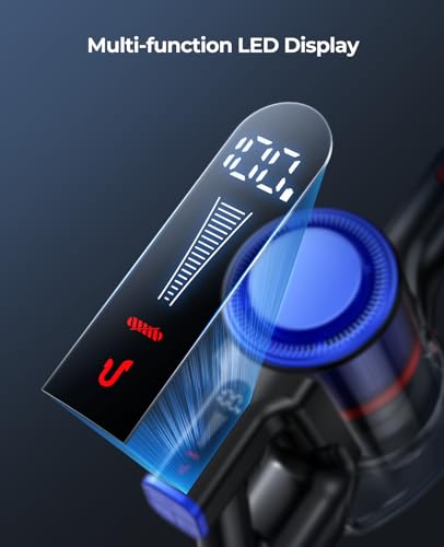 MULTI-FUNCTION LED DISPLAY: Elite 9 handheld vacuum cleaner is equipped with a simple button adjustment system and a clear display screen, and the function display is intuitive and easy to understand. Users can easily view the vacuum cleaner’s suction mode, remaining power, and blockage warnings of the roller brush or air duct to ensure a smooth and no-worry cleaning process