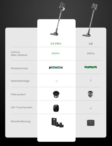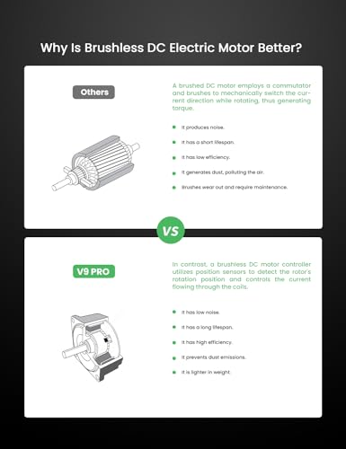 【Powerful 250W Brushless Motor】Featuring a robust 250W brushless motor, V9 Pro vacuum cleaner is engineered for enhanced durability and reduced noise levels. With a suction power of up to 35000 Pa, this cordless vacuum cleaner swiftly captures dust, particles, debris, and pet hair on hard floors and low pile carpets.