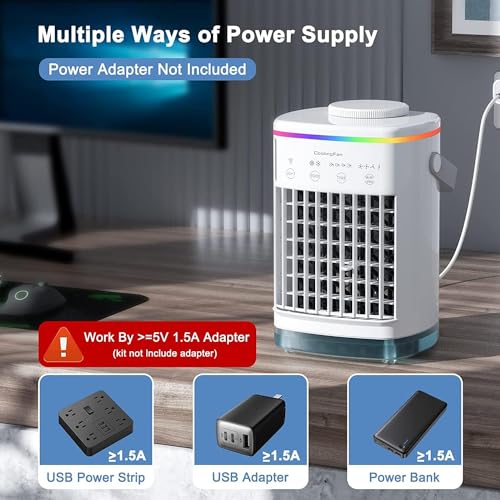 【Adjustable 3 Mode & 4 Wind Speed】: Room Air Conditioners have 3 modes (Natural Wind/Low Cool Mist/High Cool Mist) & 4 wind speeds (Low/Natural/Mid/High) with 120°Up and down adjustable wind direction. The combination of multiple modes and wind speeds gives you more choices. It is recommended to add ice cubes for a better experience, USB charging port can be powered with a power bank, laptop, adapters, mobile power sources, computers, and vehicle chargers, no adapter included.