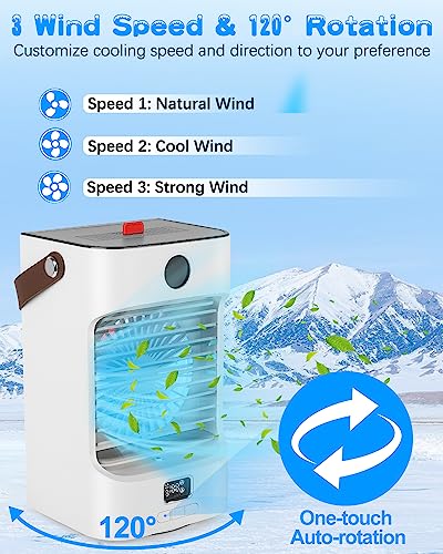 โใ๐ ๐๐ฉ๐๐๐๐ฌ&๐๐๐ยฐ ๐๐จ๐ญ๐๐ญ๐ข๐จ๐งใ: The small air conditioner offers three adjustable wind speeds and automatic 120-degree rotation, providing a customizable and efficient cooling experience that covers a wider area. Just press the button to adjust the speed and start the rotation.