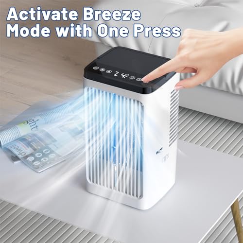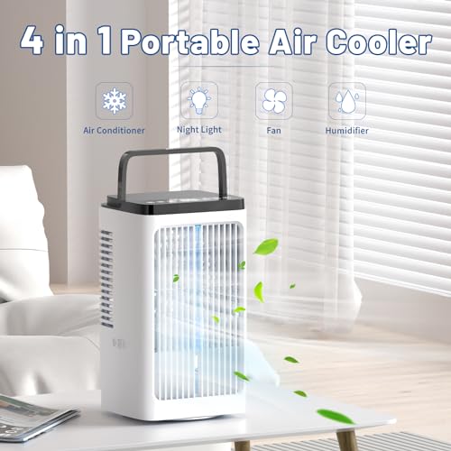 4-in-1 Portable Air Conditioner:4-in-1 air conditioner is a combination of mini air conditioner and humidifier, equipped with air conditioner, humidifier and LED ambient light.You can add ice/water/essential oils to make it a mini air conditioner that produces cool and humid air.