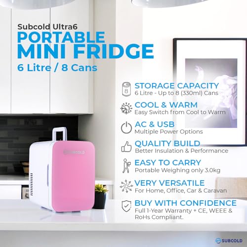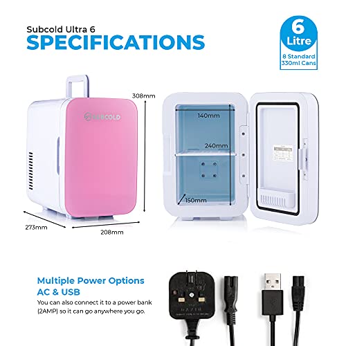 Subcold Ultra 6 Mini Fridge Cooler & Warmer | 6L capacity | Compact, Portable and Quiet | AC+USB Power Compatibility (Pink)
