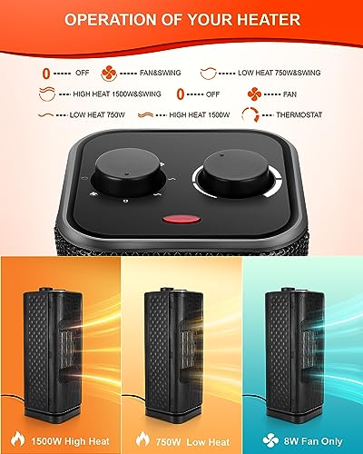 Versatile Modes & Energy Efficiency: With 6 distinctive modes and 3 power levels, our room heater offers a customizable heating experience tailored to your needs. Choose from high-heat (1500W), low-heat (750W), or regular fan mode (8W) to match your comfort level. This energy-efficient approach ensures optimal warmth while also helping you save on energy costs.