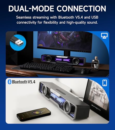 [Dual-Mode Connection] The Bluetooth V5.4 audio receiver ensures seamless, stable streaming. The included USB cable transmits power and audio from your computer to the speaker. Bluetooth for wireless convenience and USB for a direct connection, providing flexibility and high-quality sound.