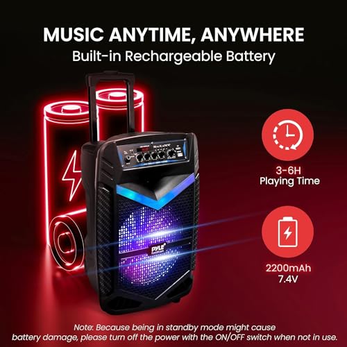 RECHARGEABLE BATTERY: This Pyle PA speaker is great for karaoke, stage performances & crowd control. It is fully portable, thanks to its built-in rechargeable battery w/ level indicator, convenient wheels & carry handle so you can take it anywhere