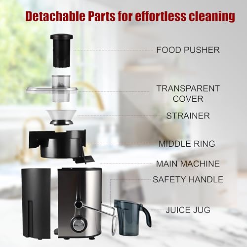 【SAFE & OVERHEAT PROTECTION】 It has a special designed safety lock arm. It won’t operate without the cover being locked in place. This is to ensure safety and reliability in use. The juicer machine comes with overheating protection. The motor will stop working if the juicer is overheated and works when the motor is cooled down.