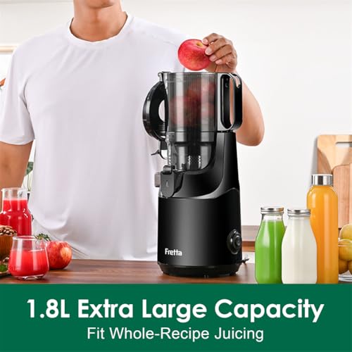 Cold Press Juicer, Fretta Slow Masticating Machines with 135mm&1.8L Chute, Fit Whole Fruits & Vegetables, Easy Clean,Self Feeding Juicer with High Juice Yield, BPA Free Tritan 250W (Black)