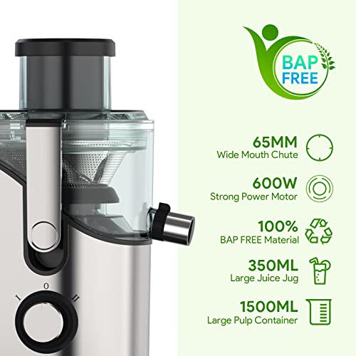 ðComfortable Size: Equipped with 350ml juice jug and 1200ml pulp container. 65mm wide feed chute, most whole fruits and vegetables can be put in directly for juicing. Suitable for personal use and save your kitchen space.