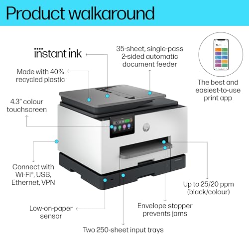 EMPOWER YOUR TEAM WITH A PRODUCTIVITY POWERHOUSE: Always ready for high volumes, get an HP OfficeJet Pro printer equipped with two 250-page input trays, Avoid waiting by the printer with an automatic document feeder enabling single-pass, double-sided scanning, Speed up your printing with a fast inkjet printer – up to 25 pages per minute (PPM)