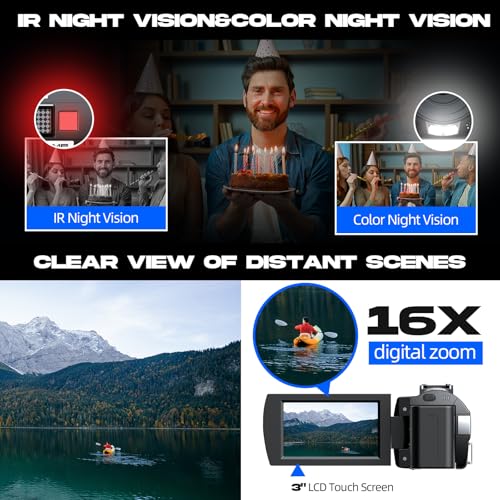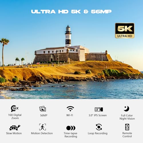 【UHD 5K Video Camera & 3.0” touch screen】-2024 Upgrade 5K video camera YouTube supports 5K 30 FPS, can capture 56MP image resolution and record 5K video. This 5K camera supports 16x digital zoom. 3.0 inch touch screen can rotate at 270° allows you to take photos and record videos at any angle. 5K video camera supports playback, continuous shooting, time-lapse, slow motion, loop recording, ect