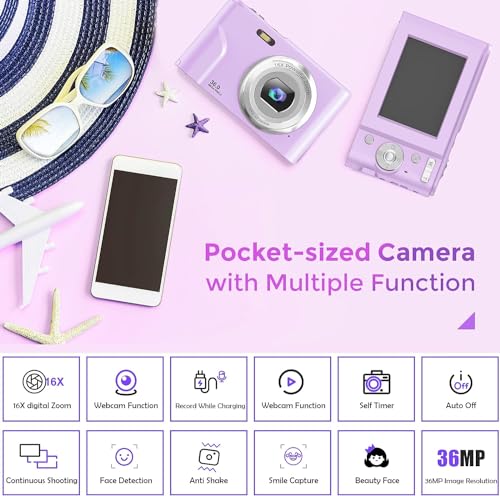 [/script]FamBrow Digital Camera, FHD 1080P 36MP Vlogging Camera Portable Mini Camera Compact Camera for Kids, Photography Beginners,Teens-Violets - Izzgadgets.com