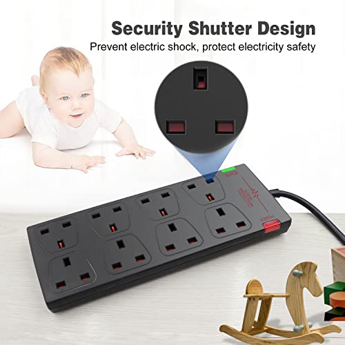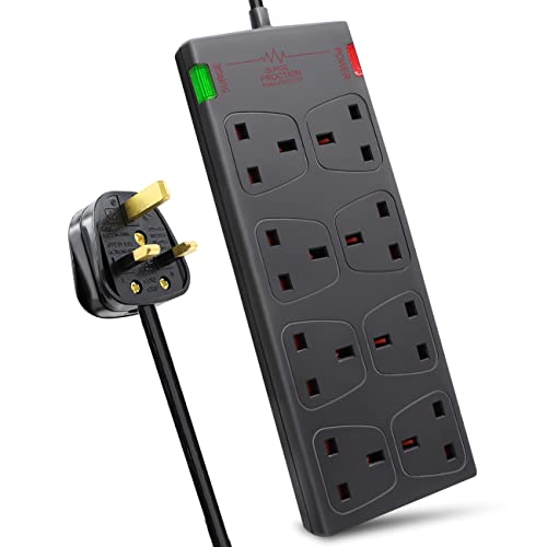 Extrastar 8 Way Extension Leads With Surge Protection, 13A 3120W Approved British Uk Wall Mounted Power Strips With 1 Metre Extension Cord For Home, Office Black