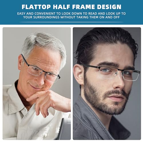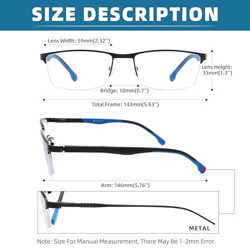 Mens anti-blue light reading glasses,semi rimless metal rectangular style.stainless steel material,slender outline,but lightweight,each pair weighs about 28 grams,sturdy and durable.Wearing size is suitable for most people
